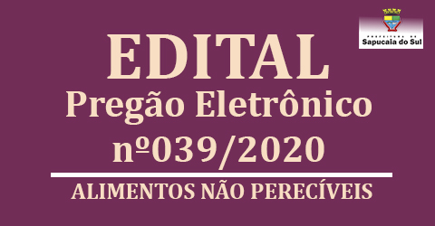 Pregão Eletrônico nº. 039/2020 – AQUISIÇÃO DE GÊNEROS ALIMENTÍCIOS NÃO PERECÍVEIS A SEREM UTILIZADAS NA CONFECÇÃO DO CARDÁPIO DA ALIMENTAÇÃO ESCOLAR NAS ESCOLAS MUNICIPAIS DE EDUCAÇÃO INFANTIL (CRECHE E PRÉ-ESCOLA), ESCOLAS MUNICIPAIS DE ENSINO FUNDAMENTAL (PRÉ-ESCOLA, ENSINO FUNDAMENTAL, EDUCAÇÃO PARA JOVENS E ADULTOS – EJA, ATENDIMENTO EDUCACIONAL ESPECIALIZADO – AEE), ESCOLAS ESTADUAIS E ENTIDADES FILANTRÓPICAS QUE ATUAM NA REDE ESCOLAR MUNICIPAL DE SAPUCAIA DO SUL DO ANO LETIVO DE 2021.