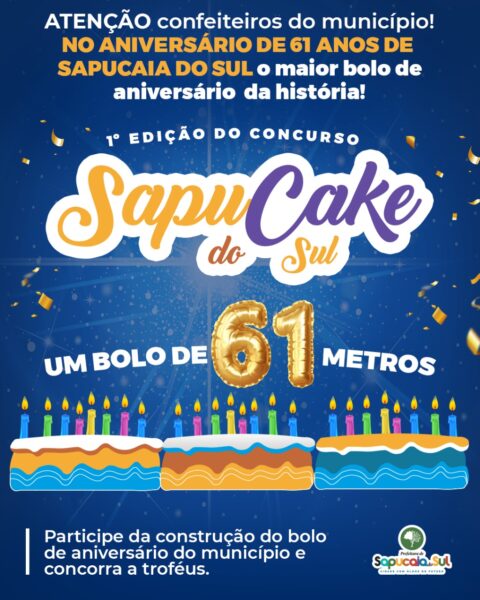 A Prefeitura de Sapucaia do Sul, em comemoração ao aniversário de 61 anos da cidade, lança a “1° Edição do concurso SapuCake”, um evento que vai reunir os melhores confeiteiros do município em um bolo de 61 metros.