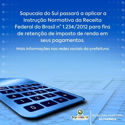A Prefeitura de Sapucaia do Sul passará a aplicar a Instrução Normativa da Receita Federal do Brasil n° 1.234/2012 para fins de retenção de imposto de renda em seus pagamentos.