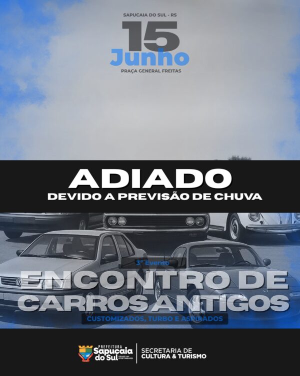 O 3º Encontro de Carros Antigos, Customizados, Turbo e Aspirados, que aconteceria no próximo domingo, dia 15 de junho, na Praça General Freitas, foi adiado devido à previsão de chuva.