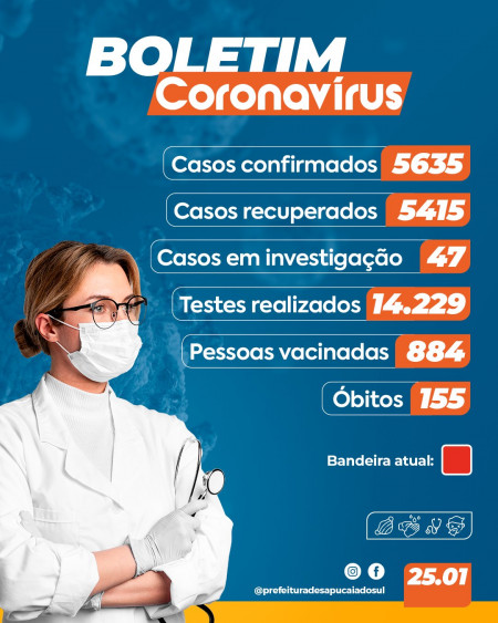 Sapucaia do Sul registrou 42 novos casos e nenhum óbito por coronavírus. Com isso, o município soma 5635 casos confirmados, 5415 pessoas recuperadas e 155 óbitos. Ao todo, 25 pessoas estão hospitalizadas e 40 em isolamento domiciliar. Até o momento, foram realizados 14229 testes, sendo que 8547 deram negativos e 47 seguem em investigação, aguardando o resultado do exame. Até o momento, já foram vacinadas 884 pessoas.