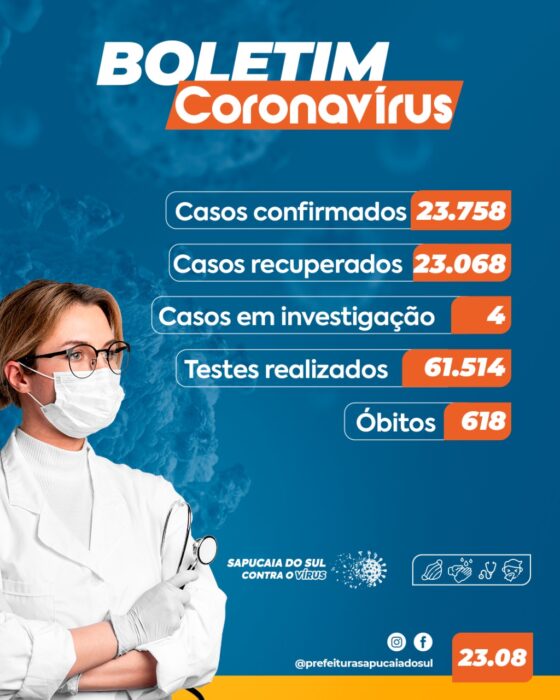 Sapucaia do Sul registrou 33 novos casos e nenhum óbito por Coronavírus. Com isso, o Município soma 23.758 casos confirmados, 23.068 pessoas recuperadas e 618 óbitos ao todo, 02 pessoas estão hospitalizadas e 70 em isolamento domiciliar.