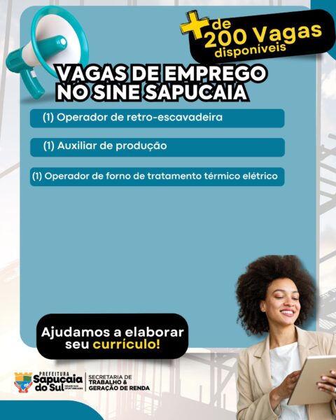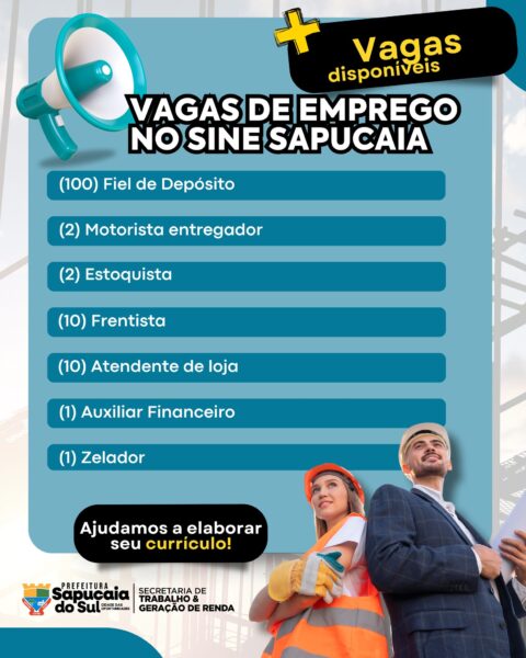 A Prefeitura de Sapucaia do Sul, por meio da Secretaria do Trabalho e Geração de Renda, em parceria com o Sine, está com várias vagas de emprego abertas para você!