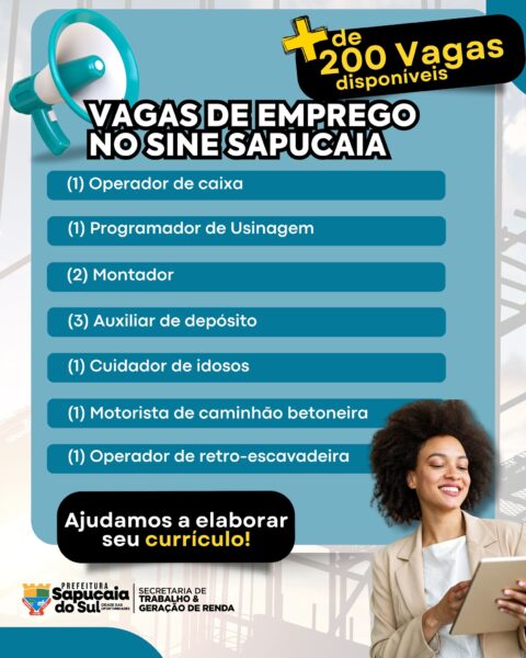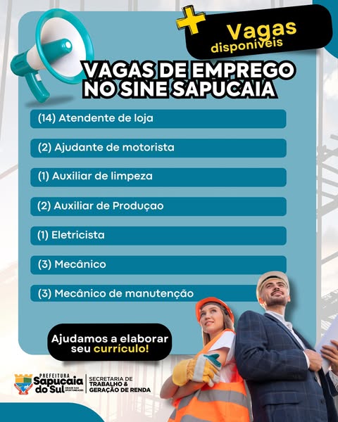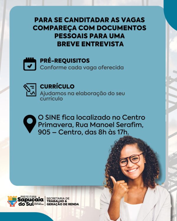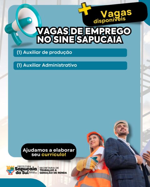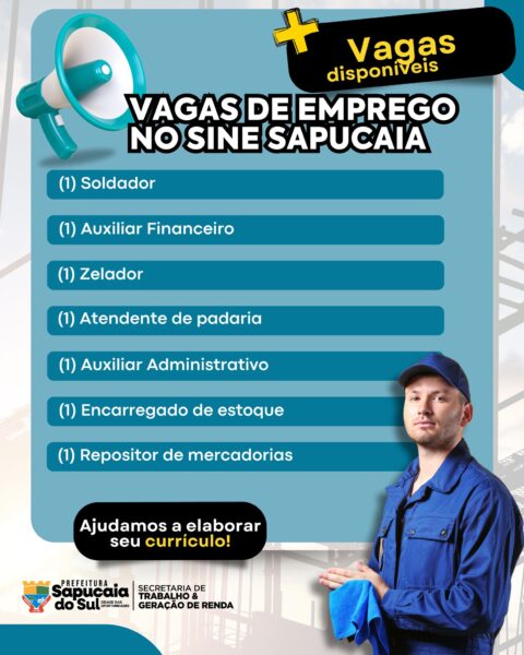 A Prefeitura de Sapucaia do Sul, por meio da Secretaria do Trabalho e Geração de Renda, em parceria com o Sine, está com várias vagas de emprego abertas para você!