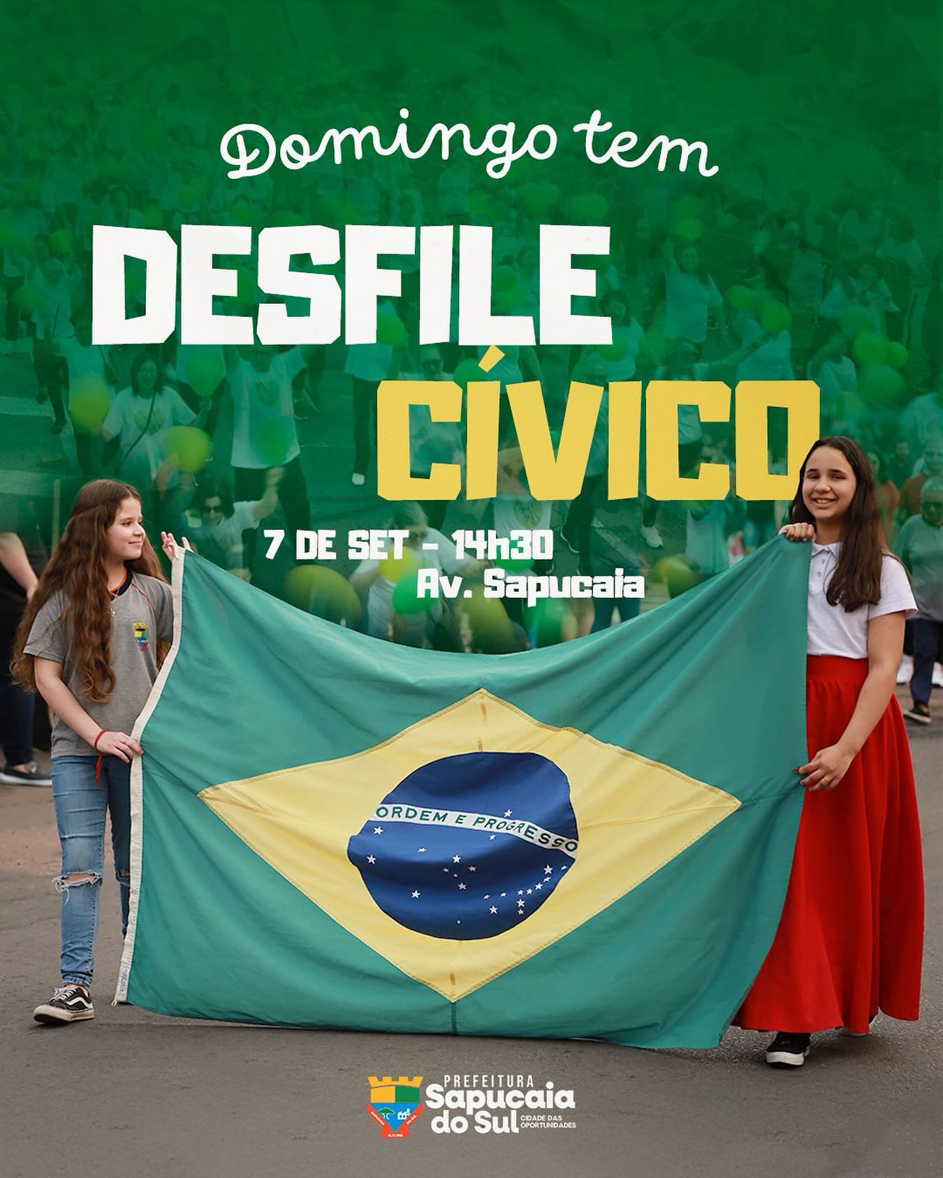 A Prefeitura de Sapucaia do Sul convida toda a comunidade para prestigiar e participar do Desfile Cívico de 7 de Setembro, que acontece neste domingo, às 14h30, na Av. Sapucaia.