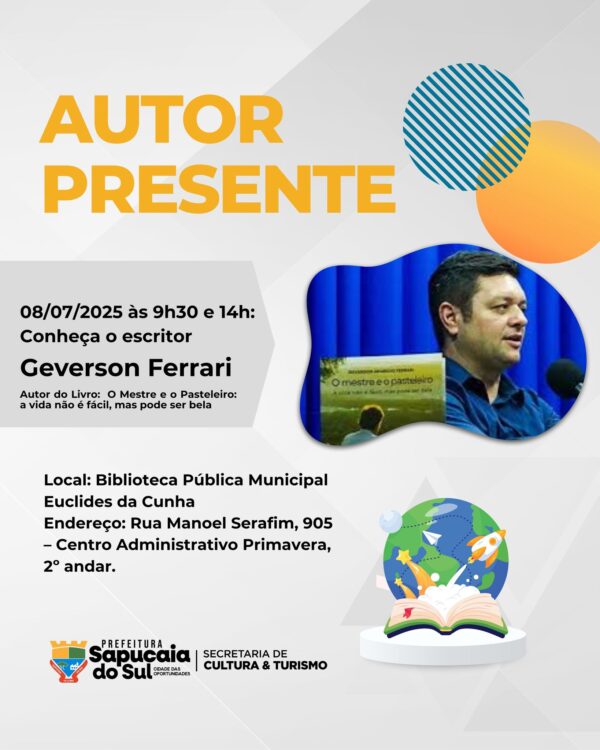 Prefeitura de Sapucaia do Sul, por meio da Secretaria de Cultura e Turismo, convida para a atividade “Autor Presente”.