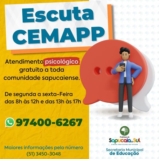 A prefeitura de Sapucaia do Sul, através da Secretaria de Educação, disponibilizou o projeto ESCUTA CEMAPP (Centro Municipal de Apoio Psicológico e Psicopedagógico) para toda a comunidade Sapucaiense.