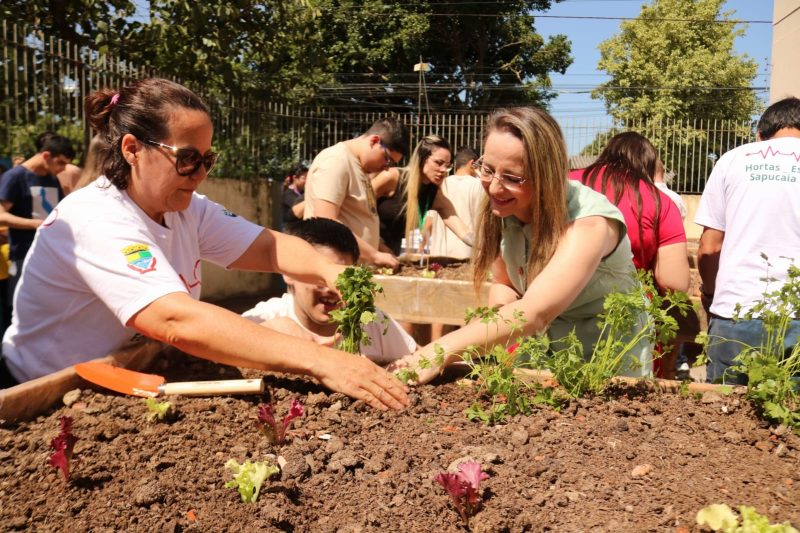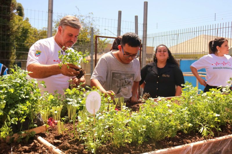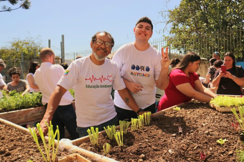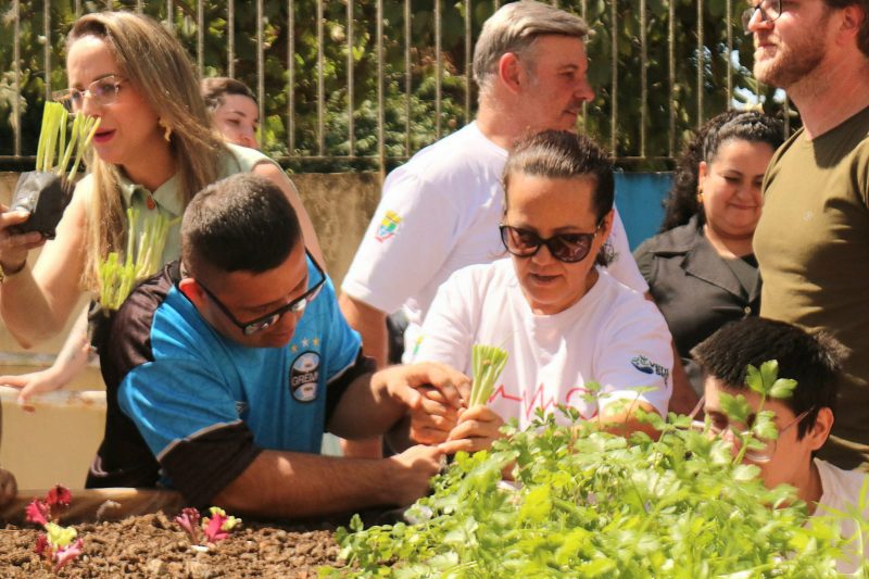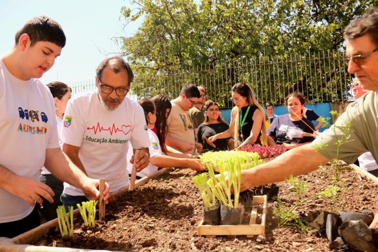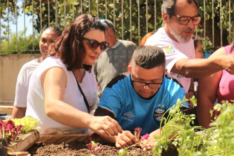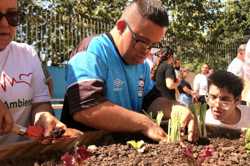 Estudantes da Associação de Pais e Amigos dos Excepcionais (Apae) de Sapucaia do Sul participaram de uma atividade de plantio de hortaliças e temperos em uma horta acessível. A ação integra o projeto Hortas Sustentáveis e Acessíveis, desenvolvido pelo Gabinete da Primeira-Dama, em parceria com a Secretaria Municipal de Meio Ambiente.