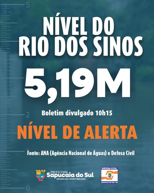 O nível do Rio dos Sinos está em 5,19 metros, conforme boletim das 10h15 da Agência Nacional das Águas, com status de ALERTA.