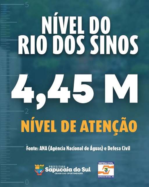 O nível do Rio dos Sinos está em 4,45 metros, com status de ATENÇÃO.