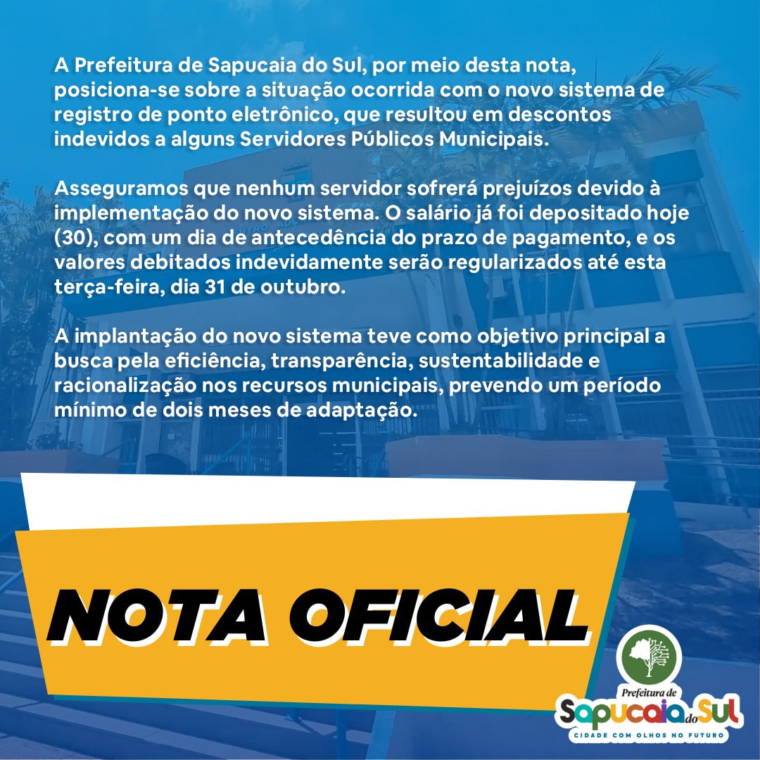 A Prefeitura de Sapucaia do Sul, por meio desta nota, posiciona-se sobre a situação ocorrida com o novo sistema de registro de ponto eletrônico, que resultou em descontos indevidos a alguns Servidores Públicos Municipais.