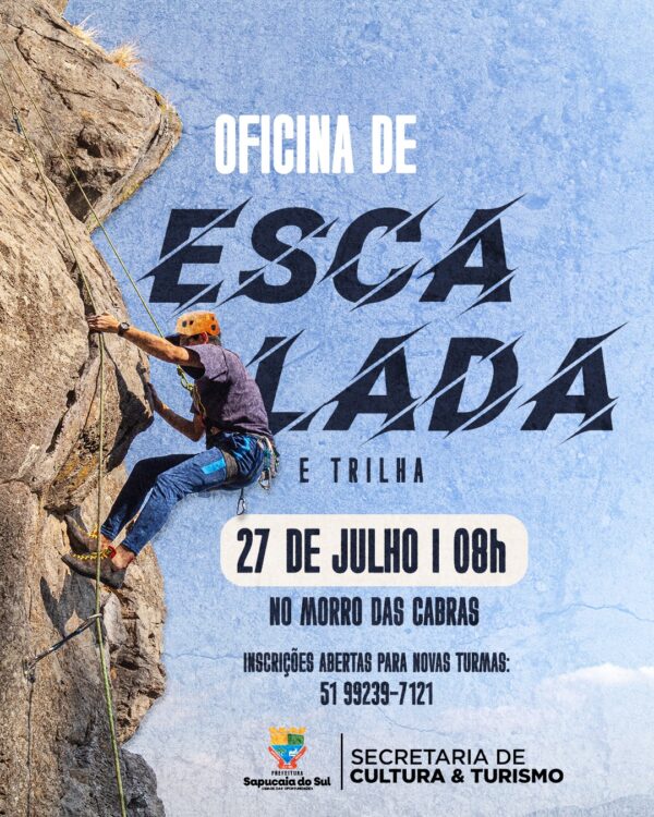 A Prefeitura de Sapucaia do Sul, por meio da Secretaria de Cultura e Turismo, informa que a Oficina de Escalada e Trilha acontecerá no dia 27 de julho (domingo), às 8h, no Morro das Cabras.