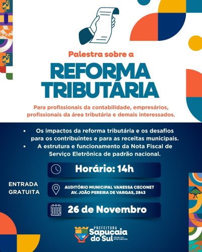 A Prefeitura de Sapucaia do Sul realiza, no dia 26 de novembro, às 14h, uma palestra sobre Reforma Tributária, no Auditório Vanessa Ceconet (Av. João Pereira de Vargas, 2843).