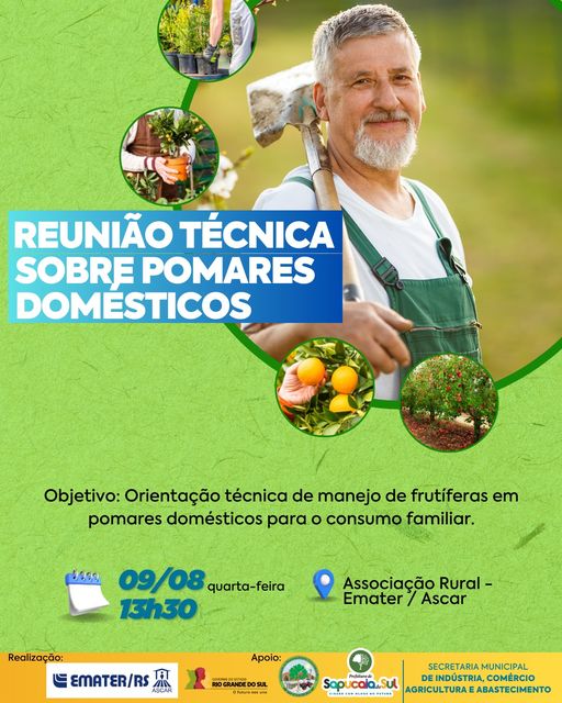 A Prefeitura de Sapucaia do Sul, através da secretaria de Indústria, Comércio, Agricultura e Abastecimento (SMICAA), e com a parceria da Emater e Governo do Estado, promove nessa quarta-feira (09), uma reunião técnica sobre “Pomares Domésticos”.