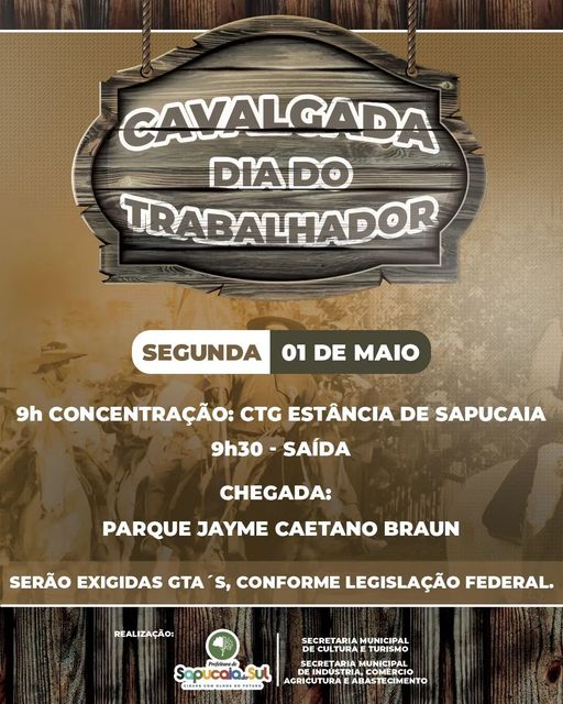 Será dia 01 de maio (segunda-feira), com concentração a partir das 9h e saída às 9h30 do CTG Estância de Sapucaia (Rua Luiz Gama, 143 – Boa Vista), onde cavaleiros e cavalarianas do município realizarão uma cavalgada até o Parque Jayme Caetano Braun ( R. Monteiro Lobato,- COHAB).