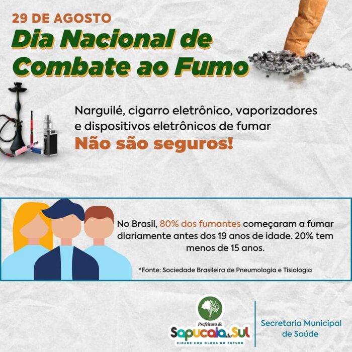 Considerando como problema de saúde pública e a importância do combate ao tabagismo, a Prefeitura de Sapucaia do Sul promove, por meio da Secretaria Municipal de Saúde, participa do Programa Nacional de Controle de Tabagismo do INCA (Instituto Nacional do Câncer).