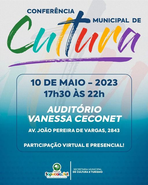 A Prefeitura de Sapucaia de Sul, através da secretaria de Cultura e Turismo, realiza no próximo dia 10 de maio, a Conferência municipal de Cultura, no auditório Vanessa Ceconet, das 17h30 às 22h.