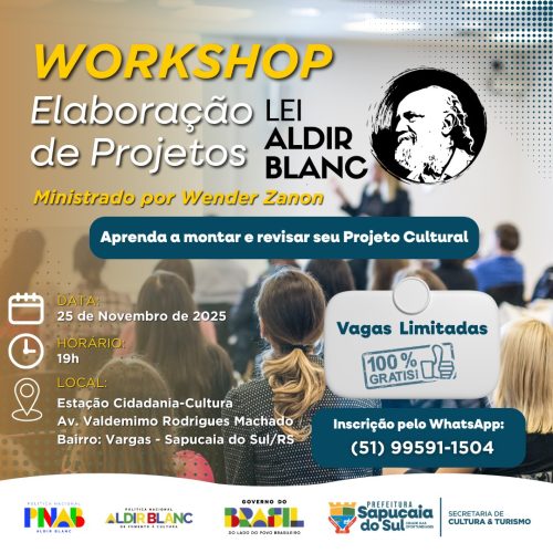 A Prefeitura de Sapucaia do Sul, por meio da Secretaria de Cultura e Turismo, promove no dia 25 de novembro, às 19h, o Workshop de Elaboração de Projetos – Lei Aldir Blanc. A atividade será realizada na Estação Cidadania-Cultura (Av. Valdemimo Rodrigues Machado, Bairro Vargas), com inscrições gratuitas e vagas limitadas.